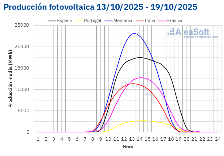 La producción solar disminuyó en la mayoría de los mercados europeos, con caídas significativas en Italia (24%) y Francia (12%). España y Portugal también registraron descensos, mientras que Alemania fue la excepción, con un aumento del 42%. Se espera que esta tendencia a la baja continúe en la semana del 20 de octubre.